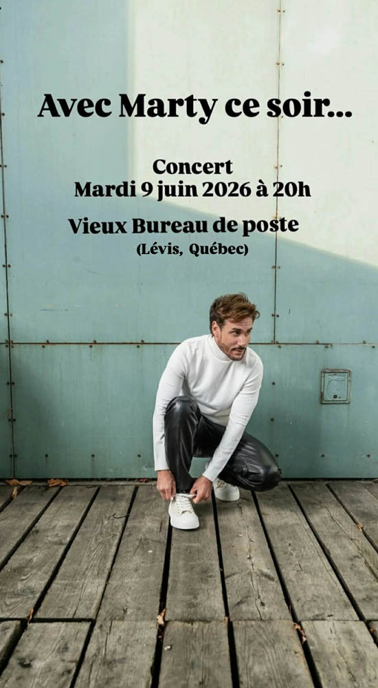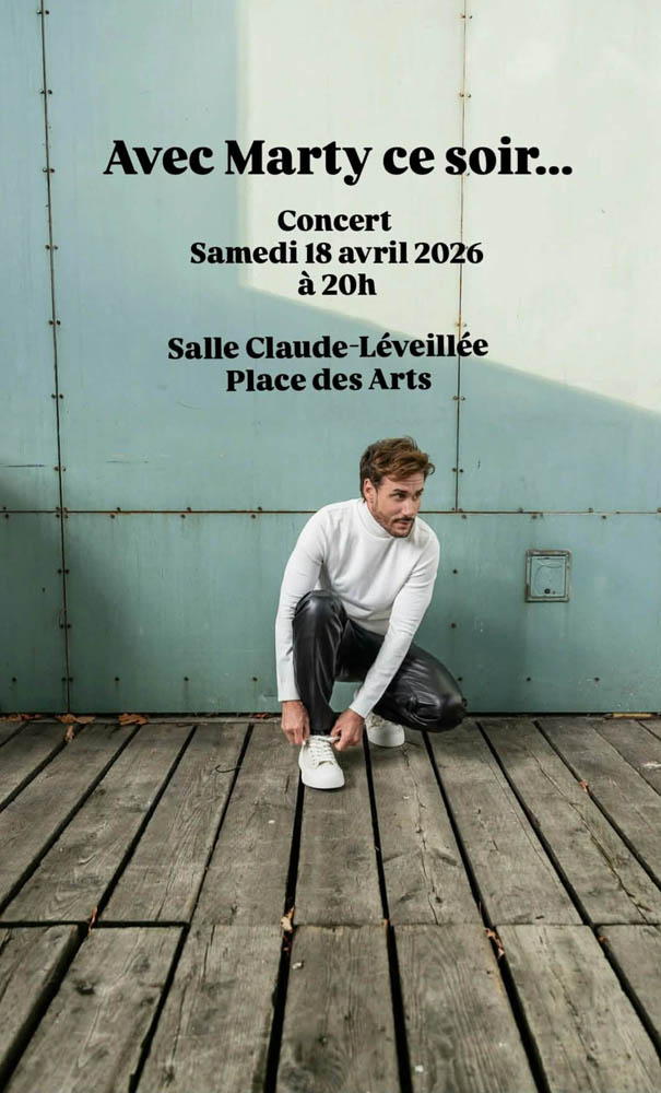 Pour ce spectacle, Marty présentera son plus récent matériel original, incluant les chansons Ta lumière et J'ai le bonheur facile. Vous pourrez découvrir ses nouvelles créations qui reflètent son style unique et sa sensibilité artistique.
